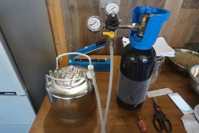 6L的Keg是我用來釀酒的罐子,二氧化碳和氮氣設備都是相通的,連氣壓表都能夠通用。前後斷斷續續試驗了一年,鼓弄出這些東西來,希望有用。