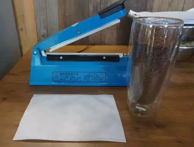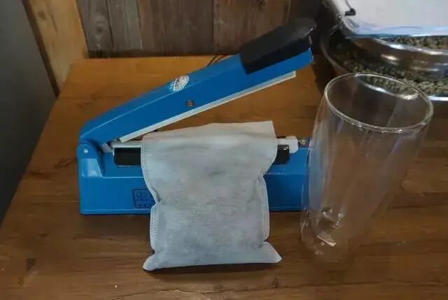 這裡使用的是無紡布濾袋,用熱封機進行封口。也可以用茶濾袋,但由於茶濾紙極容易破損,咖啡渣堵住出酒孔這一鍋就廢了,所以有必要套兩層,來個雙保險。