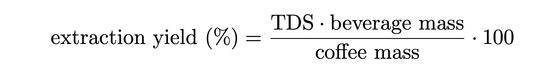 這個變量主要影響咖啡的味道,因為不同的化合物在水中溶解的速度不同。你可以用更少的咖啡獲得更高的萃取率,最終得到相同的強度。較大的萃取率,你的咖啡中會包含更多的芳香化合物,這些化合物從咖啡豆中萃取的時間更長。標準的萃取物在18-22%之間,較高的萃取率產生更苦、更澀的味道。如果你不確定澀味是什麼意思,試一試未成熟的梨,或者在100°C水溫下泡了5到10分鐘的綠茶。較低的萃取率往往產生更多的酸,有更多植物/蔬菜的味道。如果你已經知道咖啡的強度/濃度(TDS)和水粉比(咖啡液量/咖啡粉量),你可以估計出萃取率: