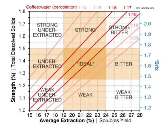 理想情況下,你的沖煮需要產生一個足夠高的強度(但不能高到壓倒你的感官感覺),這樣你就可以欣賞一杯咖啡風味的複雜性。強度/濃度涉及個人喜好,但大多數人喜歡濃度為1.15-1.35%TDS。